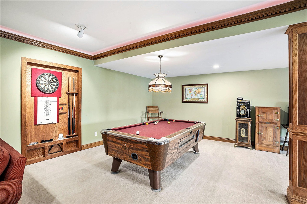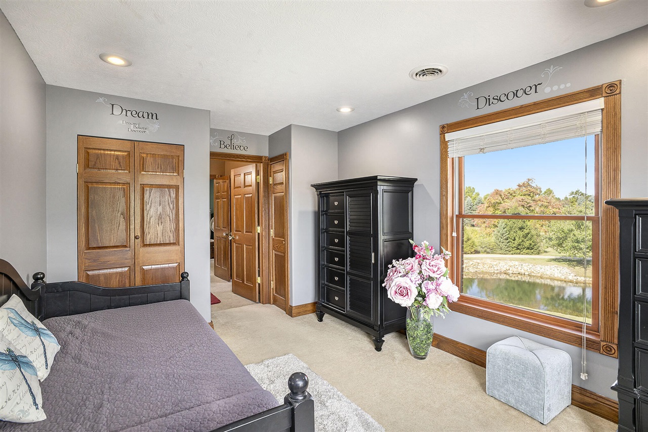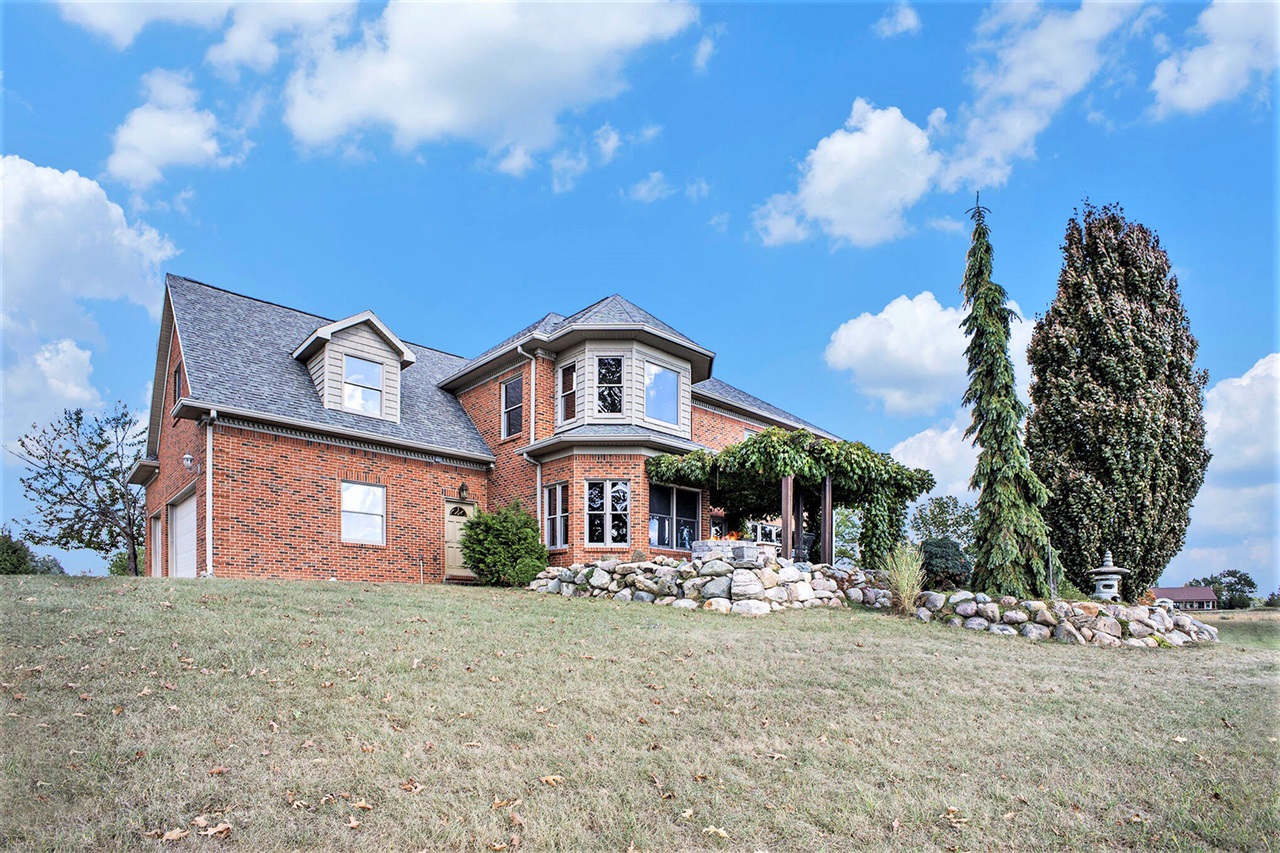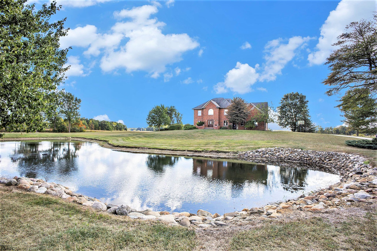 Unique opportunity to own 10 beautiful acres with lake frontage on a chain of 7 lakes. This custom-built home showcases timeless craftsmanship with natural solid wood trim, doors, and cabinetry rarely seen in modern construction. Open-concept main level with scenic views of the land and water. Step outside to a pergola wrapped in grapevines, a natural gas fire pit, and grill area with water feature. Walkout basement offers an antique bar, pool table, full bath with urinal, and a 14x8 safe room. Spacious bedrooms, home office with walnut floors, and gas fireplace with custom mantle. Kitchen features Dutch Maid cherry cabinetry, Sub-Zero refrigerator, Jen-Air cooktop, and slate flooring. Anderson windows, security system, and exterior lighting on timers. Heated and insulated pole barn with drive-in upper level, half bath, and its own well and septic. In-floor heat in basement plus separate furnaces for each level. Waterfront with steel seawall boat well, and pond with fountain.